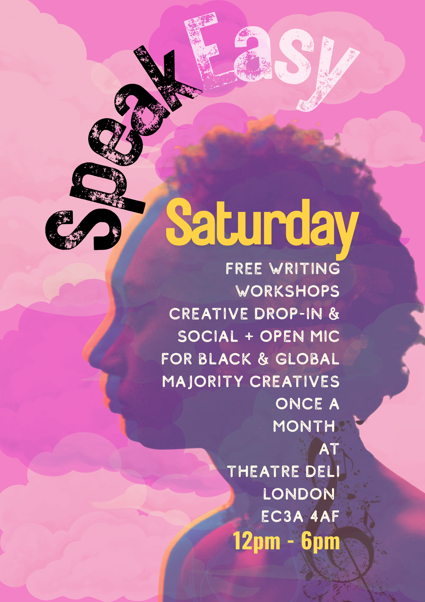 The SpeakEasy programme aligns multiple Black & Global Majority voices in unison to celebrate, community joy, empowerment, and creativity through - SpeakEasy Po’JaM a bi-monthly music and spoken word open mic SpeakEasy Page-to-Stage writing workshops, SpeakEasy Co’LaB social and creative drop-in, and SpeakEasy Co’LaB LiVE a monthly one-hour open mic, all which nurture and amplify Black and Global Majority voices. SpeakEasy Saturdays bring all the strands together in a full-day in-person programme at Theatre Deli, including Page-to-Stage, Co’LaB, and our open-mic Co’LaB LiVE.